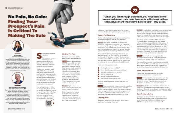 Finding the pain is part 2 of the discovery meeting . If you missed the previous installment on learning how your prospect uses technology , see the Oct ./ Nov . Issue of MSP Success by scanning the QR code or go to MSPSuccess . com / october-november-2024-issue .