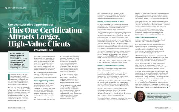 For any MSP going through the SOC 2 process , say Bickmore , it ’ s “ all about being better at what we do and being safer and more secure , so our clients , I would argue , get peace of mind .” It gives them assurance that “ we ’ re doing what we say we ’ re doing ,” says Bickmore . “ It means we ’ re a better service provider .”