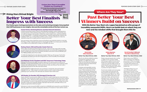 If you’ re close-minded, you’ re never going to make changes and experiment with things that have the opportunity to take you to the next level, Spencer says. When you see other MSPs having success with a particular strategy,“ go try it,” he says, echoing this year’ s winner, Julio Lopez.“ Go follow exactly what they did and see if that works. As you open up that mindset, you’ ll grow as an individual, become better, and help more people.”