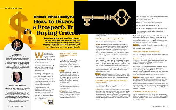 For example, if low employee turnover was important, I would remind them that this was one of the buying criteria they mentioned, then go through my MSP’ s rigorous hiring process, training, culture, compensation, internal career path, and average employee tenure. This validates the prospect’ s requirement and shows them that your MSP does meet their buying criteria.