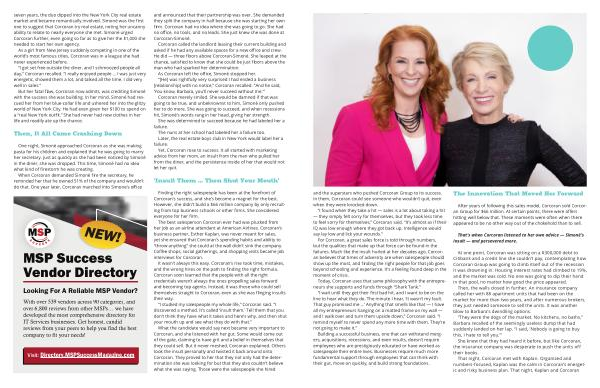 Visit : Directory . MSPSuccessMagazine . com and announced that their partnership was over . She demanded they split the company in half because she was starting her own firm . Corcoran had no idea where she was going to go . She had no office , no tools , and no leads . She just knew she was done at Corcoran-Simoné .