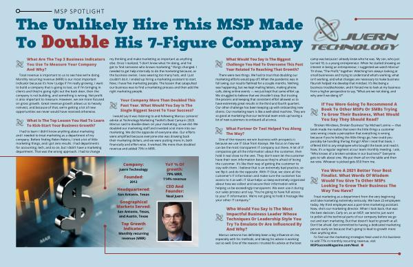 I would say it was listening to and following Marcus Lemonis ’ advice at Technology Marketing Toolkit ’ s Boot Camp in 2020 . Marcus said to double-down on your marketing , so we did . We doubled our marketing staff and invested a lot more into our marketing . We did the opposite of everyone else . Our efforts were amplified because everyone else was drawing back their marketing dollars , and we were putting more in , both financially and effort-wise . It worked . We more than doubled revenue and added 79 % in MRR .