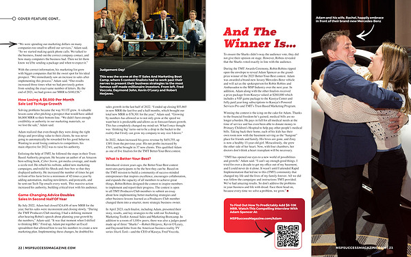 By July 2022 , Adam had closed $ 24,436 of new MRR for the year , but his sales were inconsistent and closing slowly . “ During the TMT Producers Club meeting , I had a defining moment after hearing Robin ’ s speech about planning your growth by the numbers ,” Adam said . “ It was that moment when I shifted to thinking BIG .” Fired up , Adam put together an Excel spreadsheet that allowed him to use his numbers to create a new marketing plan . Implementing these changes , he doubled his