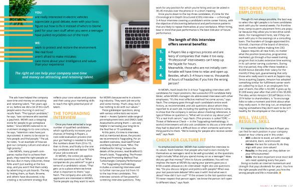 The ads have helped the company save time and money on attracting and retaining talent . “ Ten years ago or so , before we did a lot of this stuff , people were churning in and out ,” recalls Nash . “ The typical candidate ,” he says , “ was someone who wanted a paycheck . MOM ’ s was a steppingstone for people to go someplace better .” Since MOM ’ s tailored its recruitment strategy to its core culture , he says , “ retention rates have just skyrocketed . It seems to be easier to hire people and find people .” The ad , he notes , “ is an example of how we give our company culture and value a high priority .”