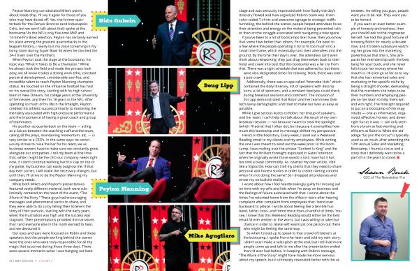 When Peyton took the stage at the bootcamp , his topic was “ What It Takes to Be a Champion .” While he always took the field and made the process look easy , we all know it takes a strong work ethic , constant personal development , considerable sacrifice , and incredible talent to reach Peyton Manning-champion status . He touched on the influence football has had on his overall life story , starting with his high school team in New Orleans , his college years at the University of Tennessee , and then his 18 years in the NFL . After spending so much of his life in the limelight , Peyton credited his athletic success primarily to mastering the mentality associated with high-pressure performance and the importance of having a great coach and group of teammates .