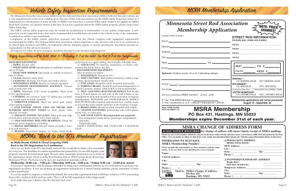 by Molly Boyum # 25046 & Cheryl Loegering # 7092 Back to the 50’ s Registration Co-Coordinators Here we are! Back to the 50’ s has finally arrived! We would like to share a few reminders for everyone. The deadline for online registration has passed but you can still register your properly insured, licensed street legal’ 64 and earlier passenger production car or truck at the registration center which is at the Best Western Plus at 1000 Gramsie Road, Shoreview, Minnesota 55126. The hours to pick up your registration materials will be: Wednesday, 10:00 a. m.- 7:00 p. m. • Thursday, 8:00 a. m.- 8:00 p. m. • Friday, 8:00 a. m.- 12:00 p. m.( noon) If you have registered a vehicle, please remember to bring your confirmation letter( s) as you will need it to pick up your registration packet( s). If you are picking up registration materials for a friend / family member, please remember to have written permission.