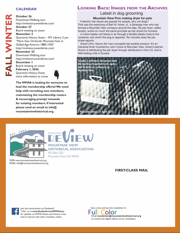 October 26 Downtown Walking tour http:// mvhistory. eventbrite. com / October 27 Board meeting on zoom November 2 Quarterly History Event – MV Library 2 pm“ More than Orchards: Mountain View in Gilded Age America 1880-1920” http:// mvhistory. eventbrite. com / November 23 Downtown Walking tour http:// mvhistory. eventbrite. com / December 1 Board meeting on zoom February 1, 2026 Quarterly History Event more information to come
