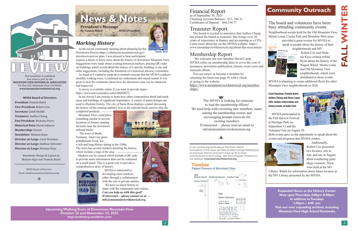 This newsletter is published four times a year by the MOUNTAIN VIEW HISTORICAL ASSOCIATION P. O. Box 252, Mountain View, CA 94042 www. mountainviewhistorical. org