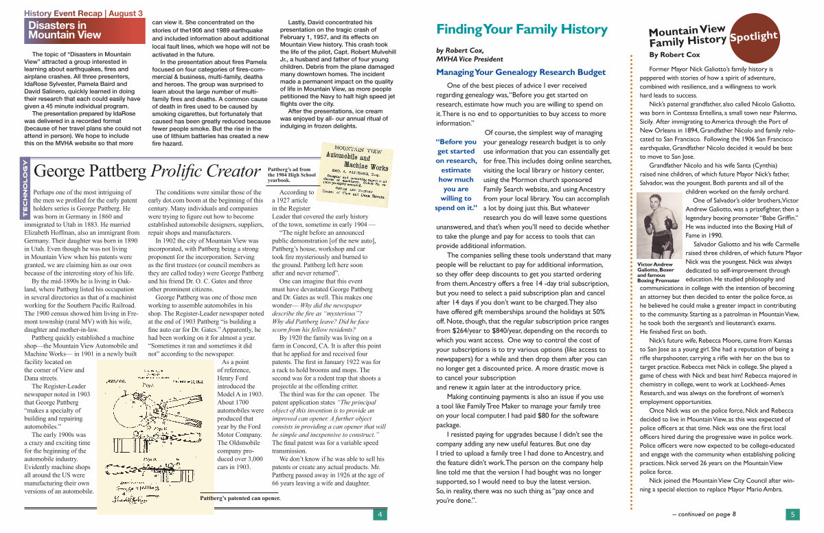 Pattberg quickly established a machine shop— the Mountain View Automobile and Machine Works— in 1901 in a newly built facility located on the corner of View and Dana streets.