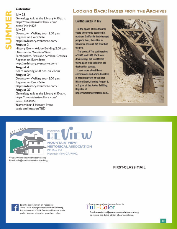 Learn more about these earthquakes and other disasters in Mountain View at the next History Event, Sunday, August 3, at 2 p. m. at the Adobe Building. Register at http:// mvhistory. eventbrite. com /.