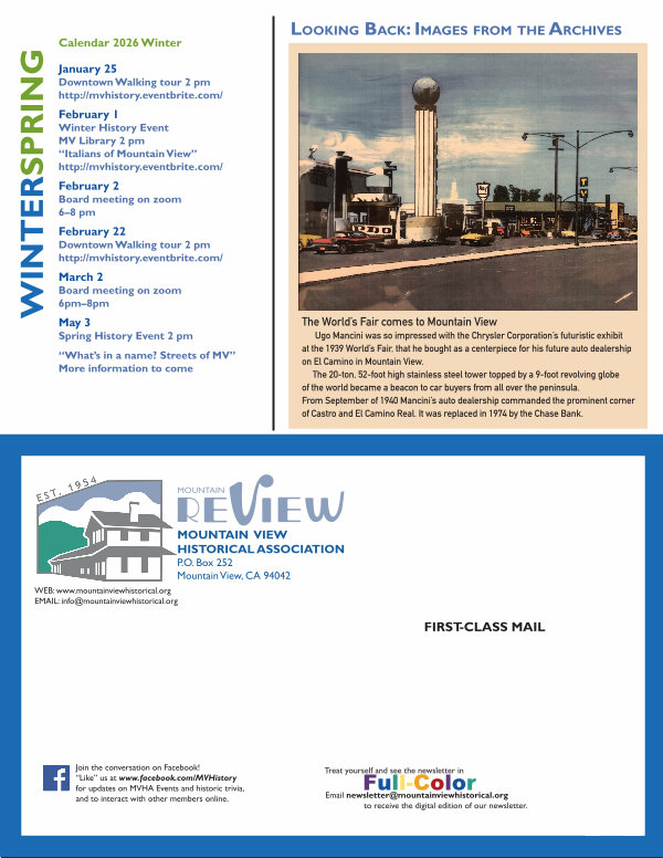 The 20-ton, 52-foot high stainless steel tower topped by a 9-foot revolving globe of the world became a beacon to car buyers from all over the peninsula. From September of 1940 Mancini’ s auto dealership commanded the prominent corner of Castro and El Camino Real. It was replaced in 1974 by the Chase Bank.
