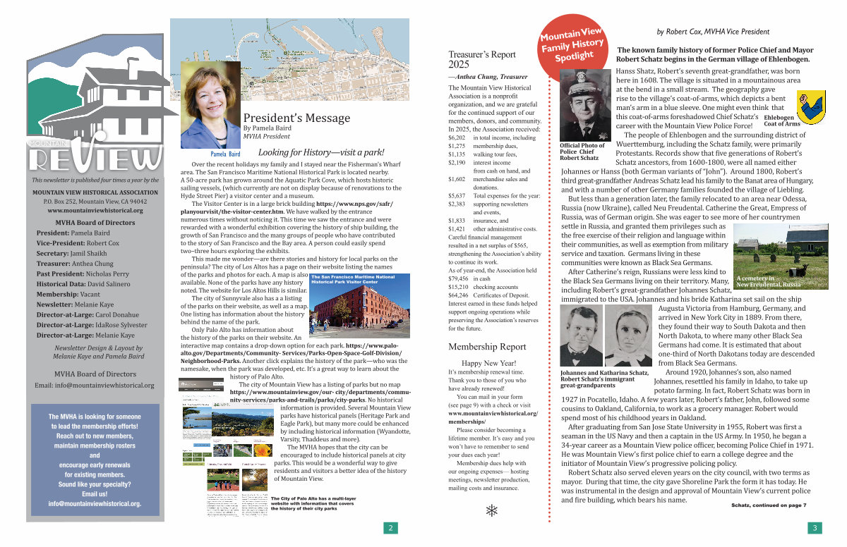 The MVHA is looking for someone to lead the membership efforts! Reach out to new members, maintain membership rosters and encourage early renewals for existing members. Sound like your specialty? Email us! info @ mountainviewhistorical. org.