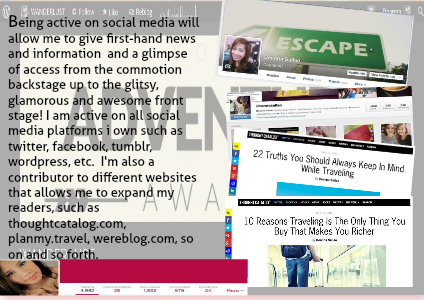 Being active on social media will allow me to give first-hand news and information and a glimpse of access from the commotion backstage up to the glitsy, glamorous and awesome front stage! I am active on all social media platforms i own such as twitter, facebook, tumblr, wordpress, etc. I'm also a contributor to different websites that allows me to expand my readers, such as thoughtcatalog.com, planmy.travel, wereblog.com, so on and so forth.