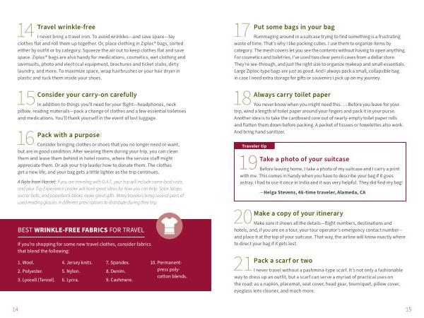 but are in good condition . After wearing them during your trip , you can clean them and leave them behind in hotel rooms , where the service staff might appreciate them . Or ask your trip leader how to donate them . The clothes get a new life , and your bag gets a little lighter as the trip continues .