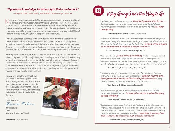 Not that long ago , it was unheard of for a woman to venture out on her own and travel for her own enjoyment . Today , here at Overseas Adventure Travel , more than 50 % of our travelers are solo women , and they ’ re over 60 years of age . As a Baby Boomer , it makes me proud to think we ’ re still blazing trails . But the truth is , there ’ s a very wide range of women who decide , at one point or another , to travel as solos — and we don ’ t all think of ourselves as firebrands ( though we ’ re all spirited in different ways ).
