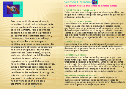 Esta nueva edición sobre el mundo educativo, tratará sobre lo importante que es la educación aunque a veces no se le de la misma. Para poder tener educación, es necesaria la presencia de padres que transmitan tradición y costumbres, dándoles educación y aprendizaje. Pero por otra parte también se precisa la escuela para dar una base para el futuro. La educación no es solo una palabra, abarca areas como cultura (costumbres), religión, acciones, identidad, sociabilización, convivencia, conocimientos, experiencia, dar posibilidades para herramientas y pensamientos creativos, ayuda a formarnos como persona, no tiene que ver solo con la palabra si no también con las acciones. A lo largo de esta revista se podrán encontrar 4 secciones: Literatura, actualidad, humor y una sección de juegos. Esperamos que lo disfruten!