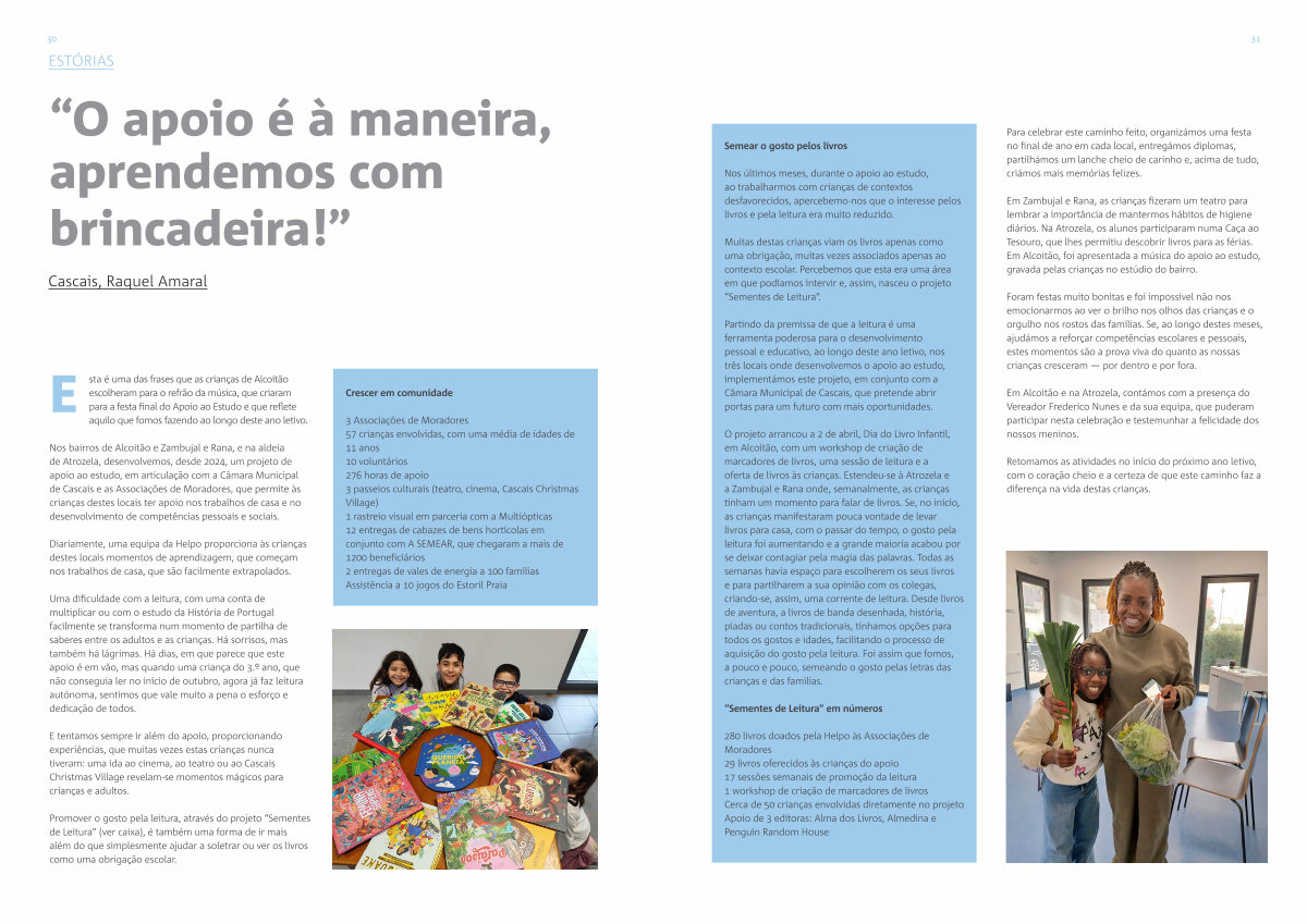 Nos bairros de Alcoitão e Zambujal e Rana, e na aldeia de Atrozela, desenvolvemos, desde 2024, um projeto de apoio ao estudo, em articulação com a Câmara Municipal de Cascais e as Associações de Moradores, que permite às crianças destes locais ter apoio nos trabalhos de casa e no desenvolvimento de competências pessoais e sociais.