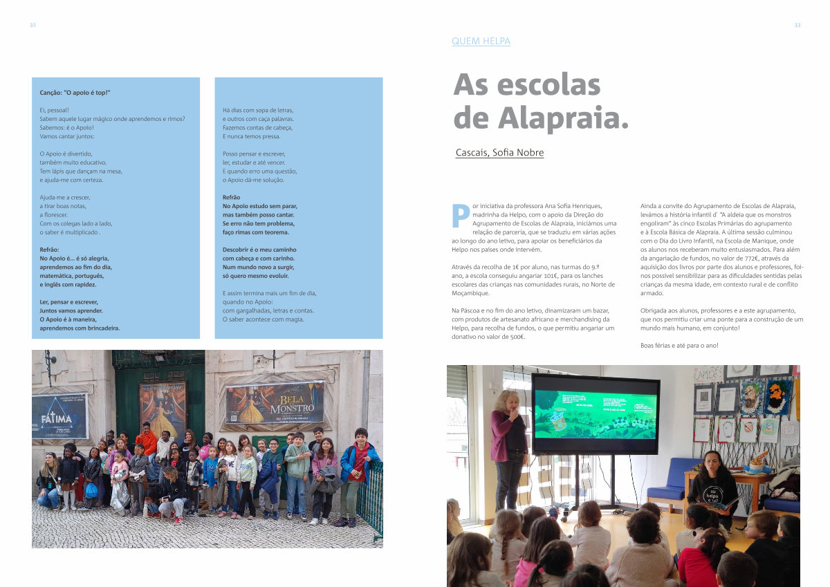 Por iniciativa da professora Ana Sofia Henriques, madrinha da Helpo, com o apoio da Direção do Agrupamento de Escolas de Alapraia, iniciámos uma relação de parceria, que se traduziu em várias ações ao longo do ano letivo, para apoiar os beneficiários da Helpo nos países onde intervém.