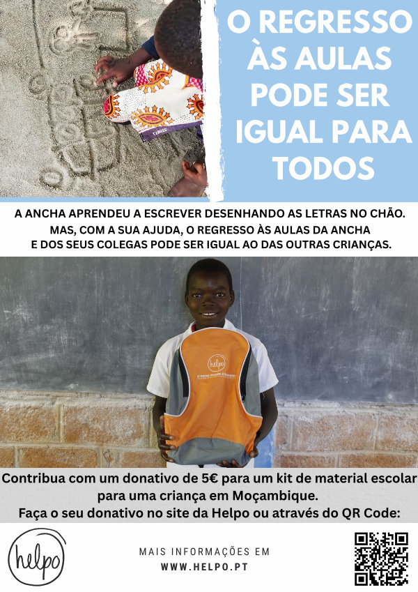 Contribua com um donativo de 5 € para um kit de material escolar para uma criança em Moçambique. Faça o seu donativo no site da Helpo ou através do QR Code: