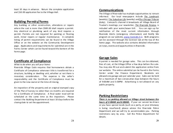 What to do when you sell your home: Riverside Village Code requires that homeowners obtain a Certificate of Compliance whenever title is transferred for a structure, building or dwelling unit, whether or not there is monetary consideration. The expense is the seller’ s responsibility and the Certificate of Compliance must be given to the new owner at the time of closing.