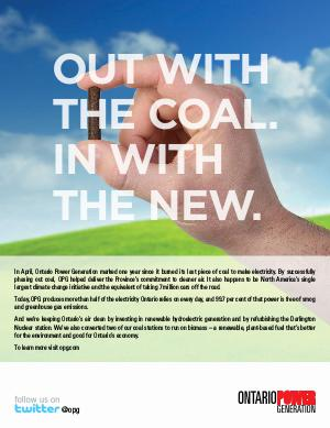 In April, Ontario Power Generation marked one year since it burned its last piece of coal to make electricity. By successfully phasing out coal, OPG helped deliver the Province’ s commitment to cleaner air. It also happens to be North America’ s single largest climate change initiative and the equivalent of taking 7 million cars off the road.