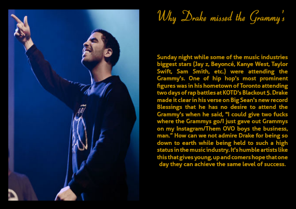 Sunday night while some of the music industries biggest stars (Jay z, Beyoncé, Kanye West, Taylor Swift, Sam Smith, etc.) were attending the Grammy's. One of hip hop's most prominent figures was in his hometown of Toronto attending two days of rap battles at KOTD's Blackout 5. Drake made it clear in his verse on Big Sean's new record Blessings that he has no desire to attend the Grammy's when he said, "I could give two fucks where the Grammys go/I just gave out Grammys on my Instagram/Them OVO boys the business, man.” How can we not admire Drake for being so down to earth while being held to such a high status in the music industry. It's humble artists like this that gives young, up and comers hope that one day they can achieve the same level of success.