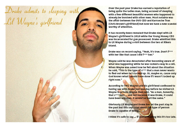According to TMZ Wayne said his girlfriend confessed to having sex with Drake just one day before he visited Lil Wayne in prison. Wayne then said, “As a man, honestly, that s*** hurt … and not because it was Drake, it could have been any man. It would’ve hurt the same.”