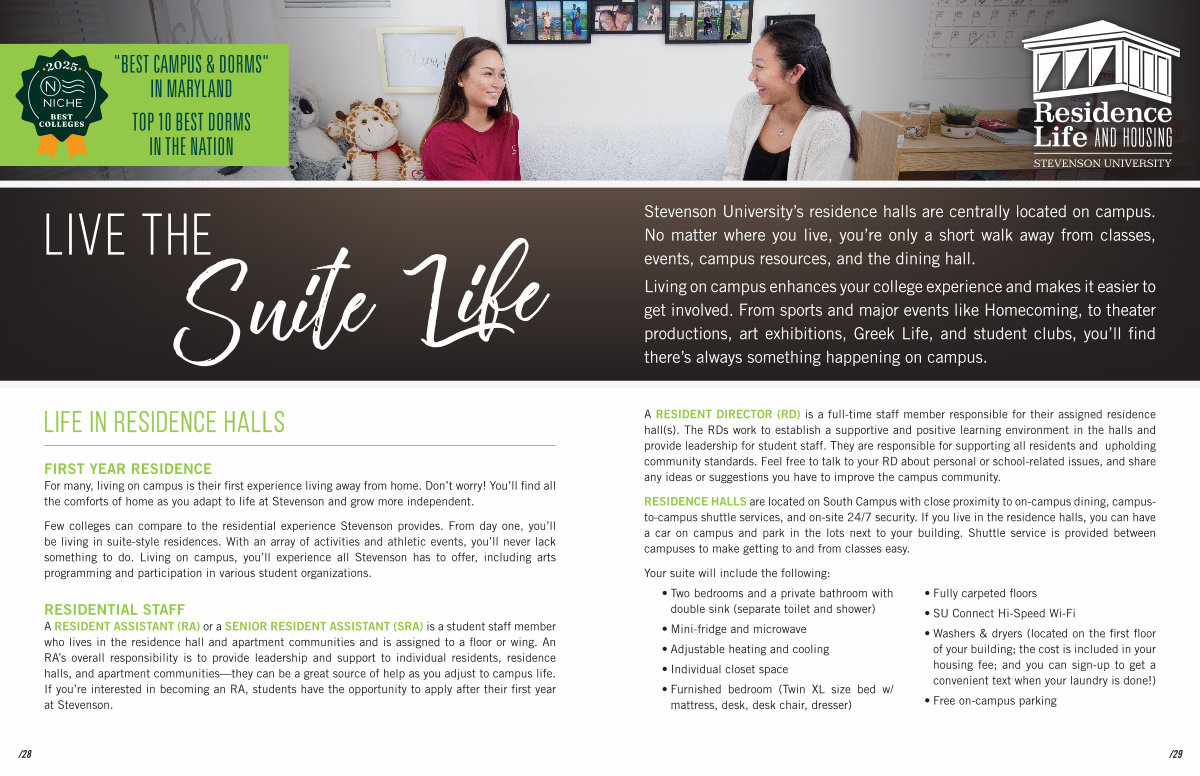Stevenson University’ s residence halls are centrally located on campus. No matter where you live, you’ re only a short walk away from classes, events, campus resources, and the dining hall. Living on campus enhances your college experience and makes it easier to get involved. From sports and major events like Homecoming, to theater productions, art exhibitions, Greek Life, and student clubs, you’ ll find there’ s always something happening on campus.