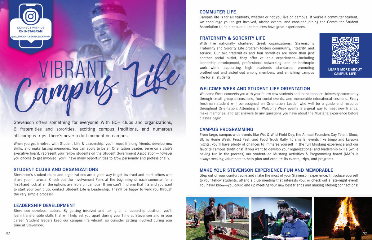 Stevenson offers something for everyone! With 80 + clubs and organizations, 6 fraternities and sororities, exciting campus traditions, and numerous off-campus trips, there’ s never a dull moment on campus.