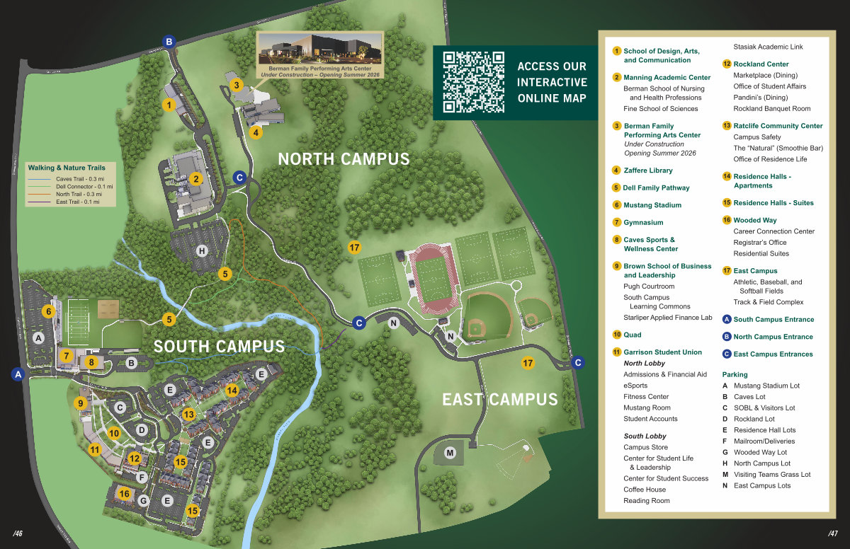 NORTH CAMPUS SOUTH CAMPUS 1 2 4 3 B C C H 5 5 6 7 8 A B A 9 10 11 12 13 15 15 16 14 C D E E N E E F G 17 Berman Family Performing Arts Center Under Construction – Opening Summer 2026 Walking & Nature Trails Caves Trail- 0.3 mi Dell Connector- 0.1 mi North Trail- 0.3 mi East Trail- 0.1 mi / 46