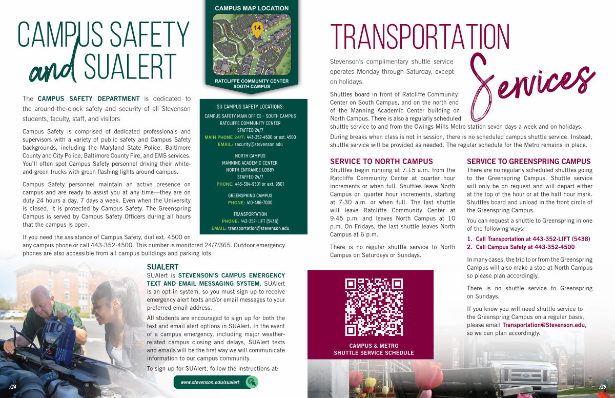 CAMPUS SAFETY MAIN OFFICE- SOUTH CAMPUS RATCLIFFE COMMUNITY CENTER STAFFED 24 / 7 MAIN PHONE 24 / 7: 443-352-4500 or ext. 4500 EMAIL: security @ stevenson. edu
