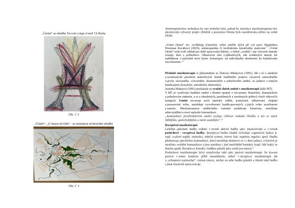 Předmět muzikoterapie si připomeňme se Zlaticou Mátejovou ( 1991 ). Jde v ní o záměrné a systematické působení jednotlivých složek hudebního projevu výrazově umocněného o prvky slovesného , výtvarného , dramatického a pohybového umění , na jedince s různým handicapem ( fyzickým , mentálním , duševním ). Autorka Mátejová ( 1991 ) poukázala na využití složek umění v muzikoterapii ( dále MT ). V MT je využíváno hudební umění v těsném spojení s výtvarnem , literárním , dramatickým a pohybovým uměním , a to u ohrožených , postižených a narušených jedinců všech věkových kategorií . Umění navozuje nové způsoby vidění , poznávání , odhalování , chápání a posuzování světa , umožňuje vysvobození handicapovaných z jejich světa uzavřenosti a samoty . Mnohostrannost uměleckého vnímání podněcuje kreativitu , umožňuje sebevyjádření a nové způsoby komunikace . „ Komunikace prostřednictvím umění zvyšuje citlivost vnímání člověka a ten se stává lidštějším , společenštějším a méně osamělým “. 2a /