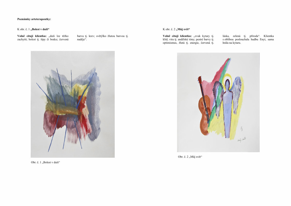 Volně cituji klientku: „ zvuk kytary tj. klid; víra tj. andělské tóny; pestré barvy tj. optimismus, žlutá tj. energie, červená tj. láska, zelená tj. příroda“. Klientka s oblibou poslouchala hudbu Enyi, sama hrála na kytaru.