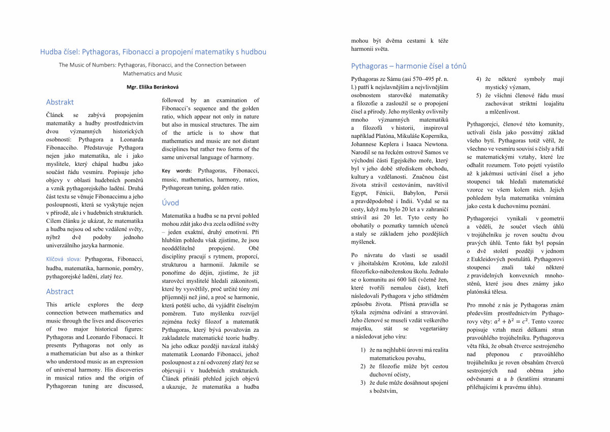 Článek se zabývá propojením matematiky a hudby prostřednictvím dvou významných historických osobností: Pythagora a Leonarda Fibonacciho. Představuje Pythagora nejen jako matematika, ale i jako myslitele, který chápal hudbu jako součást řádu vesmíru. Popisuje jeho objevy v oblasti hudebních poměrů a vznik pythagorejského ladění. Druhá část textu se věnuje Fibonaccimu a jeho posloupnosti, která se vyskytuje nejen v přírodě, ale i v hudebních strukturách. Cílem článku je ukázat, že matematika a hudba nejsou od sebe vzdálené světy, nýbrž dvě podoby jednoho univerzálního jazyka harmonie.