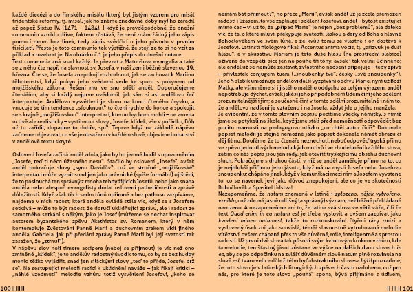 Text communia zná snad každý. Je převzat z Matoušova evangelia a také se z něho čte např. na slavnost sv. Josefa, v naší zemi běžně slavenou 19. března. Čte se, že Josefa znepokojí rozhodnout, jak se zachovat k Mariinu těhotenství, když pokyn jeho svědomí vede ke sporu s pokynem od mojžíšského zákona. Řešení mu ve snu sdělí anděl. Doporučujeme čtenářům, aby si každý nejprve uvědomil, jak sám si asi andělovu řeč interpretuje. Andělovo vysvětlení je skoro na konci čteného úryvku, a vnucuje se tím tendence „sfouknout“ to čtení rychle do konce a spokojit se s krajně „mojžíšovskou“ interpretací, kterou bychom mohli – ne zrovna uctivě ale realisticky – vystihnout slovy „Josefe, klídek, vše v pořádku, Bůh už to zařídil, dopadne to dobře, spi“. Teprve když na základě nápěvu začneme objevovat, co vše je obsaženo v každém slově, objevíme bohatství v andělově textu skryté.