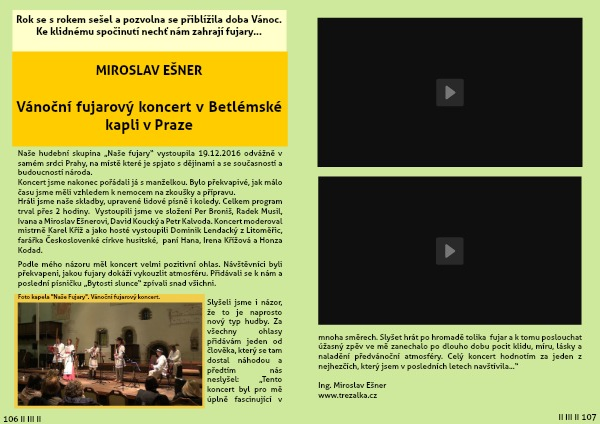 mnoha směrech. Slyšet hrát po hromadě tolika fujar a k tomu poslouchat úžasný zpěv ve mě zanechalo po dlouho dobu pocit klidu, míru, lásky a naladění předvánoční atmosféry. Celý koncert hodnotím za jeden z nejhezčích, který jsem v posledních letech navštívila...“