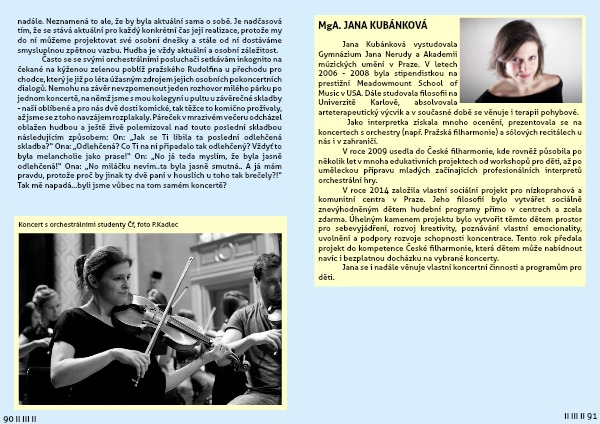 Často se se svými orchestrálními posluchači setkávám inkognito na čekané na kýženou zelenou poblíž pražského Rudolfina u přechodu pro chodce, který je již po léta úžasným zdrojem jejich osobních pokoncertních dialogů. Nemohu na závěr nevzpomenout jeden rozhovor milého párku po jednom koncertě, na němž jsme s mou kolegyní u pultu u závěrečné skladby - naší oblíbené a pro nás dvě dosti komické, tak těžce to komično prožívaly, až jsme se z toho navzájem rozplakaly. Páreček v mrazivém večeru odcházel oblažen hudbou a ještě živě polemizoval nad touto poslední skladbou následujícím způsobem: On: „Jak se Ti líbila ta poslední odlehčená skladba?“ Ona: „Odlehčená? Co Ti na ní připadalo tak odlehčený? Vždyť to byla melancholie jako prase!“ On: „No já teda myslím, že byla jasně odlehčená!“ Ona: „No miláčku nevím..ta byla jasně smutná.. A já mám pravdu, protože proč by jinak ty dvě paní v houslích u toho tak brečely?!“ Tak mě napadá...byli jsme vůbec na tom samém koncertě?
