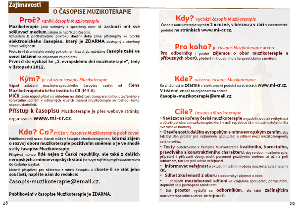 Publikovat svůj názor, článek může v časopise Muzikoterapie ten, kdo má zájem o rozvoj oboru muzikoterapie pozitivním směrem a je ve shodě s cíly časopisu Muzikoterapie.