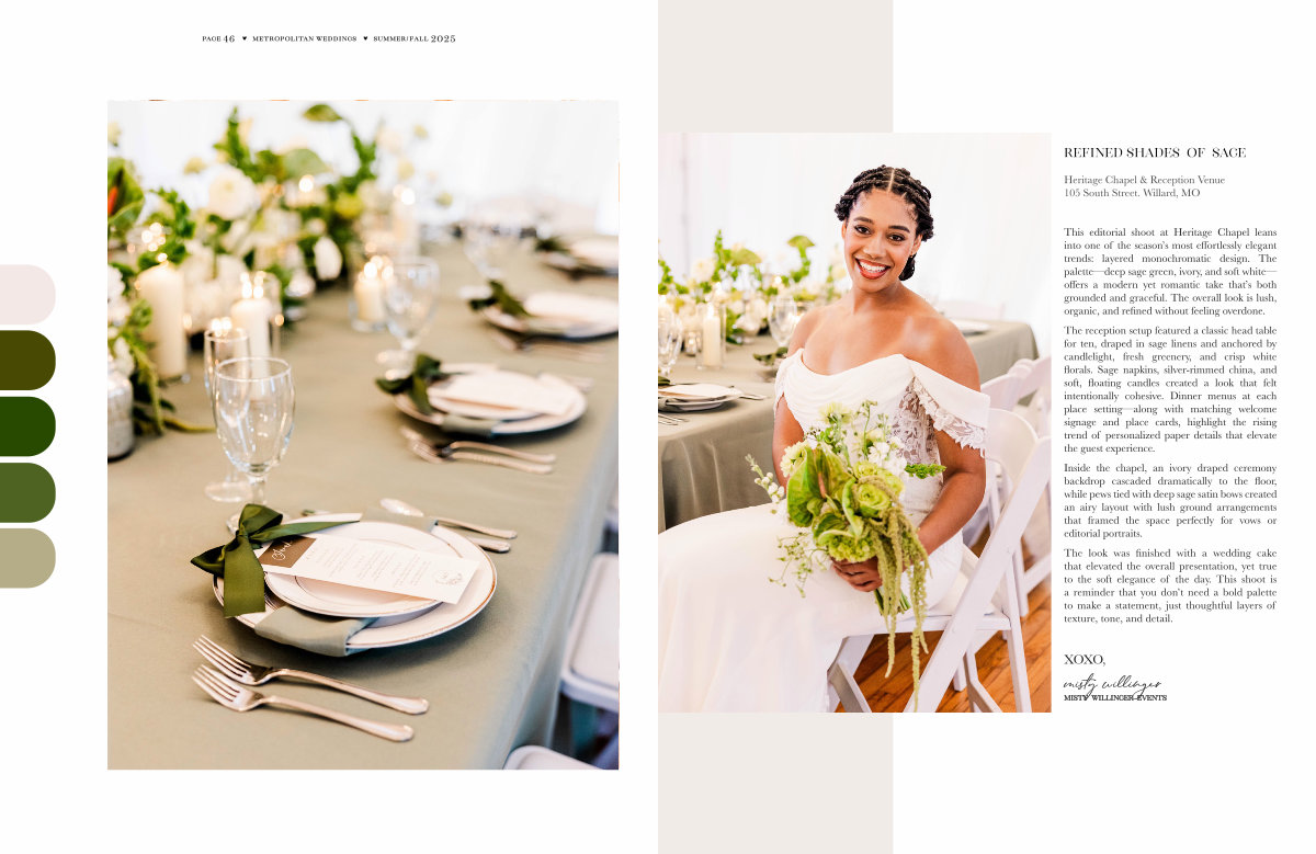 This editorial shoot at Heritage Chapel leans into one of the season’ s most effortlessly elegant trends: layered monochromatic design. The palette— deep sage green, ivory, and soft white— offers a modern yet romantic take that’ s both grounded and graceful. The overall look is lush, organic, and refined without feeling overdone.