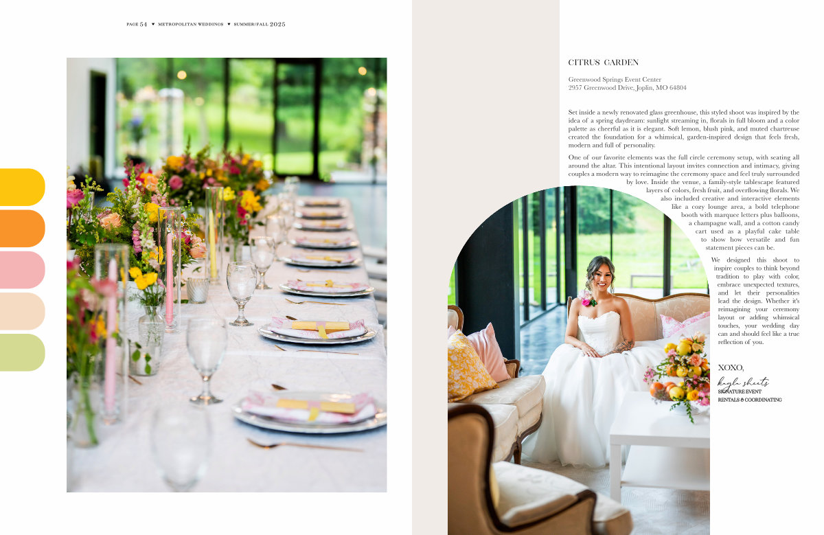 Set inside a newly renovated glass greenhouse, this styled shoot was inspired by the idea of a spring daydream: sunlight streaming in, florals in full bloom and a color palette as cheerful as it is elegant. Soft lemon, blush pink, and muted chartreuse created the foundation for a whimsical, garden-inspired design that feels fresh, modern and full of personality.