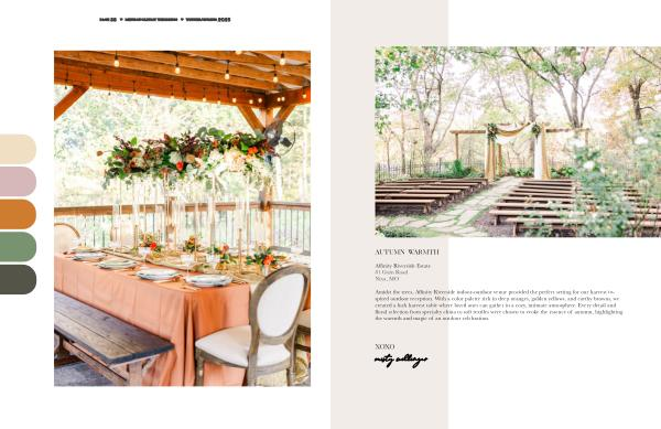 Amidst the trees , Affinity Riverside indoor-outdoor venue provided the perfect setting for our harvest inspired outdoor reception . With a color palette rich in deep oranges , golden yellows , and earthy browns , we created a lush harvest table where loved ones can gather in a cozy , intimate atmosphere . Every detail and floral selection from specialty china to soft textiles were chosen to evoke the essence of autumn , highlighting the warmth and magic of an outdoor celebration .