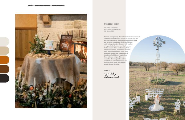 We were so inspired by the western chic theme because it celebrates our midwestern roots in an elegant way . We kept our color palette simple with rich browns , black , and cream to complement the beautiful barn , while adding other key elements with touches of copper in the flatware and ring box , and the fun texture of the cowhide rug . With a simple color palette , we were not afraid to bring patterns and texture to the setup with plaid napkins and straw chargers . Meadows of wildflowers inspired our floral and cake designs . This was such a fun shoot to plan for and we were lucky to work with vendors who believed in our vision and brought artistic ideas to the table .
