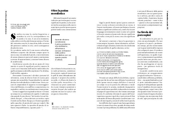 Se è difficile che il cuore di uno batta agevolmente sotto la mano di un altro, quando diciamo condivisione il primo problema che dobbiamo affrontare è cercare di liberarci dalla patina moralistica con cui questa parola si utilizza, perché è carica di « anime belle », buonismo, buona volontà, posizioni − come si dice − « giuste » e che si presumono tali, invocazioni a comportamenti appropriati.