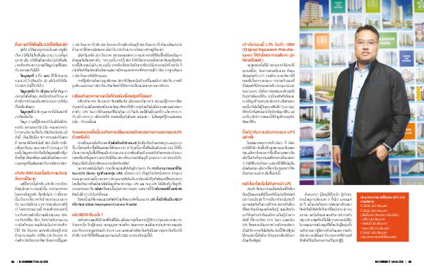 นอกจากเทคโนโลยีแล้ว การเปลี่ยนแปลงที่ส�ำคัญอีกประการ คือ การรับงานภายนอกที่เป็น Non-LPN Clients( ลูกค้านอกกลุ ่ม LPN) เนื่องจาก LPS เป็นธุรกิจบริหารโครงการ( Project Management) ฉะนั้น นอกจาก LPN และ พรสันติ แล้ว เรายังมองไปที่ธุรกิจพัฒนาที่ดินค่ายต่างๆ โดยตั้งเป้าหมายที่จะมีพอร์ตโฟลิโอลูกค้าระหว่างกลุ ่ม LPN และ Non-LPN ใกล้เคียงกัน ซึ่งลูกค้า รายแรกของเรา คือ อนันดา ซึ่งตอนนี้อยู ่ระหว่างการเจรจา นอกจากนี้ก็มี พร็อพเพอร์ตี้ เพอร์เฟค ที่สนใจให้ LPS รับไปท�ำทั้งหมด