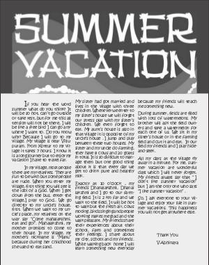 All my days at the village fly away in a minute. For me, summer vacation are wonderful days which I will never forget. My friends always say that“ I don’ t like summer vacation” but I am the only one who says“ I like summer vacation”.