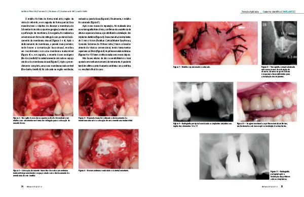 O retalho foi feito de forma total até a região da crista do rebordo, e em seguida de forma parcial. Essa manobra teve o objetivo de dissecar a membrana de Schneider do tecido conjuntivo gengival, evitando assim a perfuração da membrana. Em seguida, foi realizada a osteotomia em forma de retângulo com posterior deslocamento da membrana sinusal( Figuras 3 e 4). Após o deslocamento da membrana, a parede mais posterior, onde houve a comunicação bucosinusal, recebeu um recobrimento com uma membrana reabsorvível( Figura 4) e, em seguida, o enxerto ósseo xenógeno( Bio-Oss, Gestlich) foi cuidadosamente colocado no espaço criado sob a membrana sinusal( Figura 5). Após o preenchimento completo, uma nova membrana reabsorvível( Bio-Guide, Geistlich) foi colocada na região vestibular,