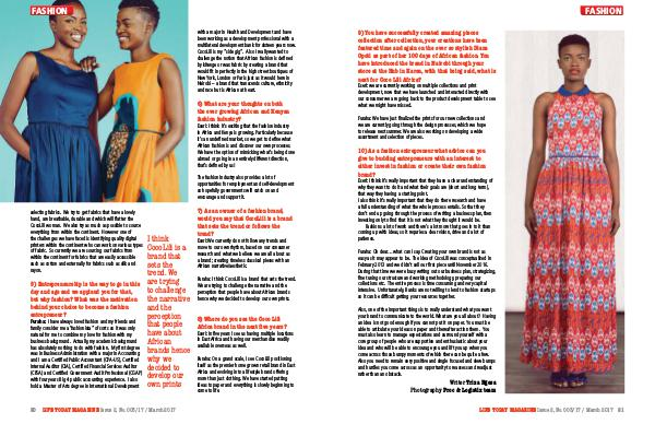 Furaha: Oh dear … what can I say. Creating your own brand is not as easy as it may appear to be. The idea of CocoLili was conceptualized in February 2013 and we didn’ t sell our fi rst piece until November 2016. During that time we were busy writing out our business plan, strategizing, fi ne tuning our structure and working methodology, preparing our collections etc. The entire process is time consuming and very capital intensive. Unfortunately, Banks are not willing to lend to fashion startups so it can be diffi cult getting your resources together.