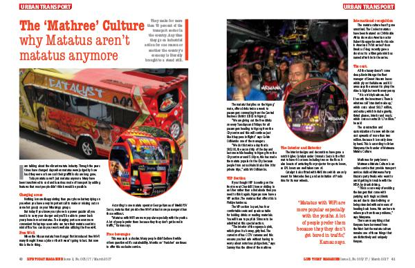 All the luxury doesn’ t come cheap. Kevin Munga the fl eet manager of Sweet Heaven buses which ply on theKahawa and KU areas says the amount to pimp the rides is high but worth every penny.“ It is a tricky business, but it’ s worth the investment. There is what we call‘ standard make up,’ which costs about Sh3.7 million, and extras, which include gravity, tinted glasses, interior and music, which costs an extra Sh1.7 million.” he said