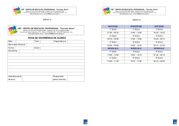 ANEXO A FICHA DE OCORRÊNCIA DE ALUNOS Data: Turno: Registrado por: Nome do(a) Aluno(a): Turma: Curso: Ocorrência: Assinatura do(a) Responsável aluno(a): pelo(a) aluno(a): 14