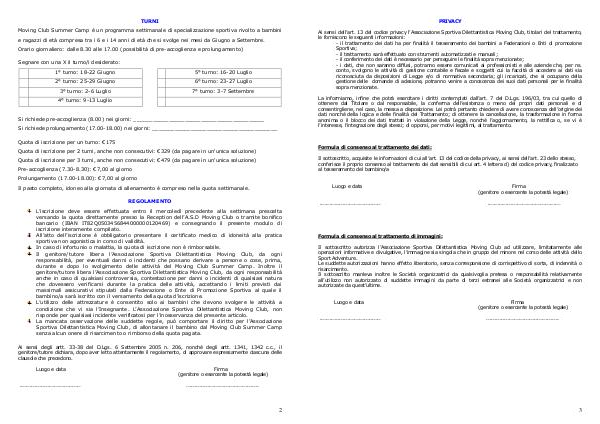 L’ iscrizione deve essere effettuata entro il mercoledì precedente alla settimana prescelta versando la quota direttamente presso la Reception dell’ A. S. D Moving Club o tramite bonifico bancario( IBAN IT82Q0503456844000000120469) e consegnando il presente modulo di iscrizione interamente compilato. All’ atto dell’ iscrizione è obbligatorio presentare il certificato medico di idoneità alla pratica sportiva non agonistica in corso di validità. In caso di infortunio o malattia, la quota di iscrizione non è rimborsabile. Il genitore / tutore libera l’ Associazione Sportiva Dilettantistica Moving Club, da ogni responsabilità, per eventuali danni o incidenti che possano derivare a persone o cose, prima, durante e dopo lo svolgimento delle attività del Moving Club Summer Camp. Inoltre il genitore / tutore libera l’ Associazione Sportiva Dilettantistica Moving Club, da ogni responsabilità anche in caso di qualsiasi controversia, contestazione per danni o incidenti di qualsiasi natura che dovessero verificarsi durante la pratica delle attività, accettando i limiti previsti dai massimali assicurativi stipulati dalla Federazione o Ente di Promozione Sportiva al quale il bambino / a sarà iscritto con il versamento della quota d’ iscrizione. L’ utilizzo delle attrezzature è consentito solo ai bambini che devono svolgere le attività a condizione che vi sia l’ Insegnante. L’ Associazione Sportiva Dilettantistica Moving Club, non risponde per qualsiasi incidente verificatosi per l’ inosservanza del presente articolo. La mancata osservazione delle suddette regole, può comportare il diritto per l’ Associazione Sportiva Dilettantistica Moving Club, di allontanare il bambino dal Moving Club Summer Camp senza alcun onere di risarcimento o rimborso della quota pagata.